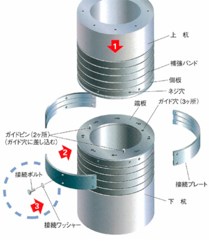 杭の継手は、従来の溶接継手から風雨時にも施工でき大幅な時間短縮が可能な「機械式継手」が普及しています。また、杭頭処理工法は、従来の中詰補強方式から固定主筋定着方式や半固定キャップ方式等が普及しています。