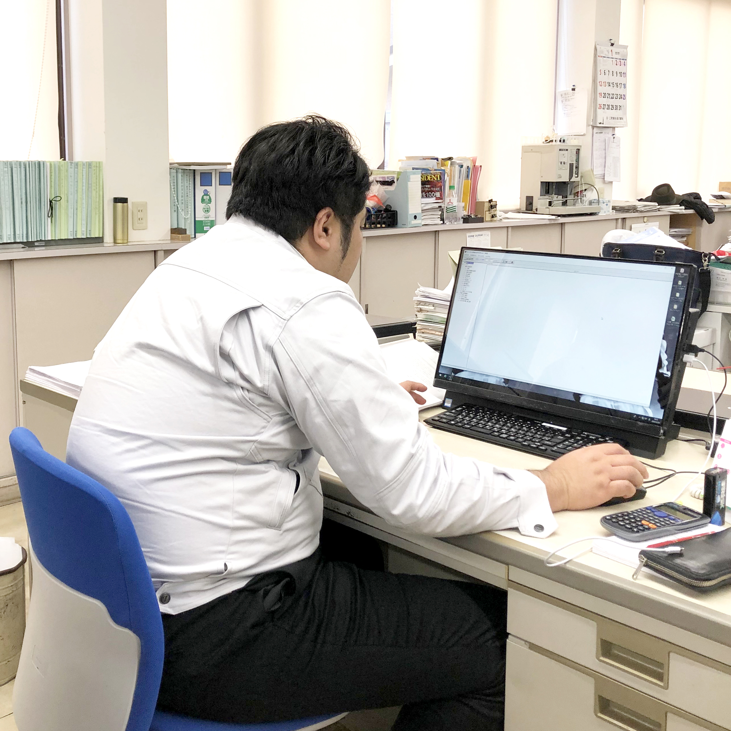 一日中社内作業に従事する日もあれば、現場確認や営業に出たり、その日その状況に応じたフレキシブルな動きと、常に知識が求められます。